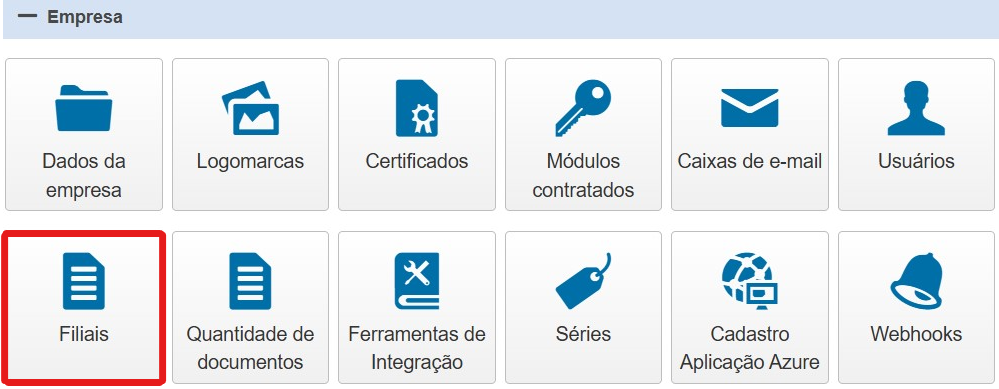 É possível ainda efetuar o cadastro automático de filiais, ao realizar a importação de documentos de uma filial que ainda não está cadastrada no InvoiCy. Para isso basta selecionar sua empresa matriz e acessar o "Painel de Controle" no InvoiCy, localizar o grupo Empresa e clicar no ícone "Filiais", tal como demonstrado no que segue: