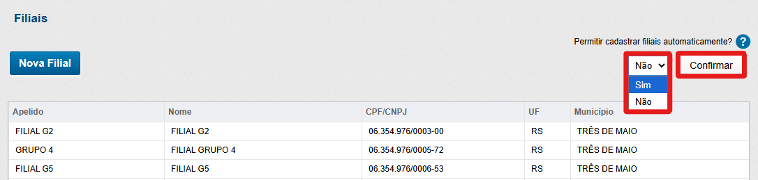 Na nova tela que será exibida, habilite a opção destacada abaixo como "Sim" e clique em "Confirmar", para que a filial seja cadastrada com base nos dados do emitente. Na tela "Log de importação" é possível acompanhar os registros para verificar se o cadastro da empresa foi realizado com sucesso ou não.