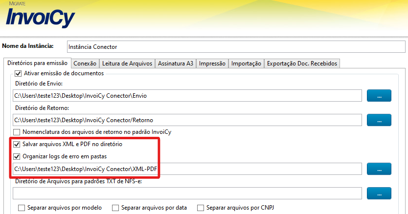 Quando o Conector realizar o envio desse arquivo, irá gerar na pasta de retorno configurada um arquivo XML com o PDF do DANFE em formato base64. Se deseja receber o retorno do arquivo em PDF também, ao configurar a instância é necessário habilitar a opção "Salvar arquivos XML e PDF no diretório", e configurar um diretório de "Retorno", conforme demonstrado a seguir: