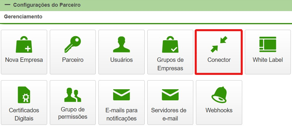 Inicialmente, é preciso cadastrar no InvoiCy um Conector, e em seguida realizar o download na máquina e prosseguir com a instalação. Para realizar este cadastro, acesse o "Painel de Controle" do InvoiCy, localize o grupo Configurações do Parceiro - Gerenciamento e clique em "Conector", conforme evidenciado a seguir: