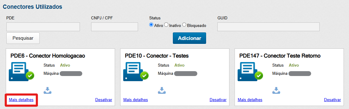 Além da possibilidade de utilizar filtros para Conectores, como o PDE (ponto de emissão), CNPJ e status (ativo, inativo ou bloqueado). Bem como, clicar em "Mais detalhes" em um dos Conectores exibidos na tela, será aberta a tela de "Edição do Conector", como destacado a seguir: