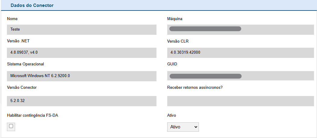 A partir disso, será exibida uma nova, onde será possível analisar as informações técnicas da máquina onde o InvoiCy Conector está instalado, como o nome da máquina, versão .NET, versão CLR, o sistema operacional, a versão do Conector e o GUID.