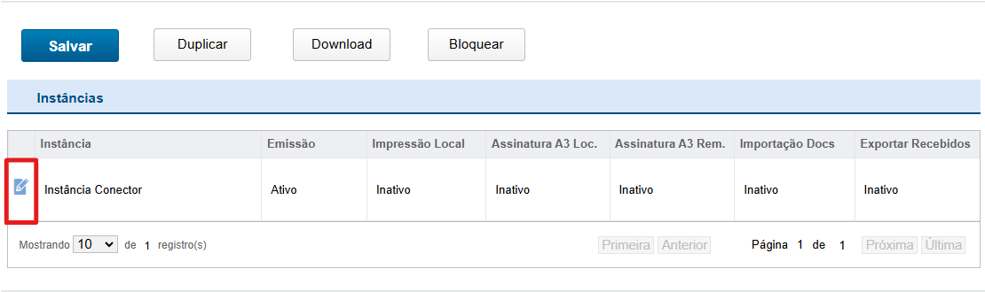 Em sequência, as informações dos serviços das instâncias cadastradas no InvoiCy Conector serão exibidas. Na opção de "Editar Instância" - destacada acima - pode-se habilitar, desativar ou bloquear a ação das instâncias em relação à emissão, impressão, assinatura A3, importação e exportação de documentos. Há também o campo "Justificativa de alteração de status", que permite descrever o motivo pelo qual tais campos estão sofrendo alterações.
