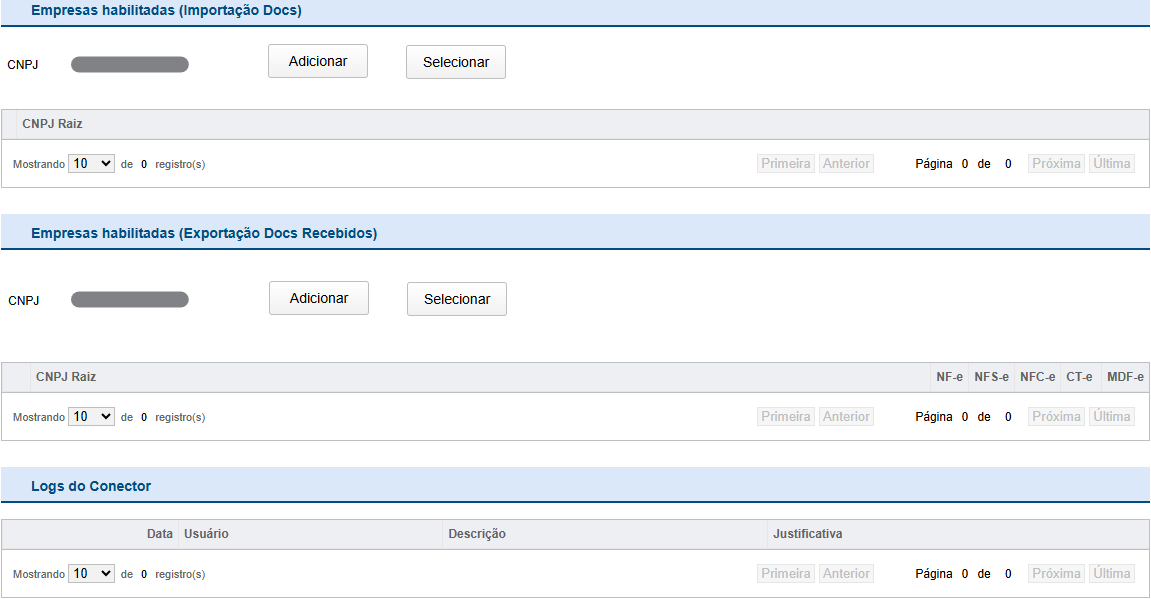 Em "Empresas Habilitadas (Exportação Docs. Recebidos)", será permitido habilitar CNPJs raízes existentes no InvoiCy para a exportação de documentos na plataforma. Para adicionar os CNPJs, realize o mesmo processo mencionado anteriormente para a opção de importação de documentos para empresas habilitadas.