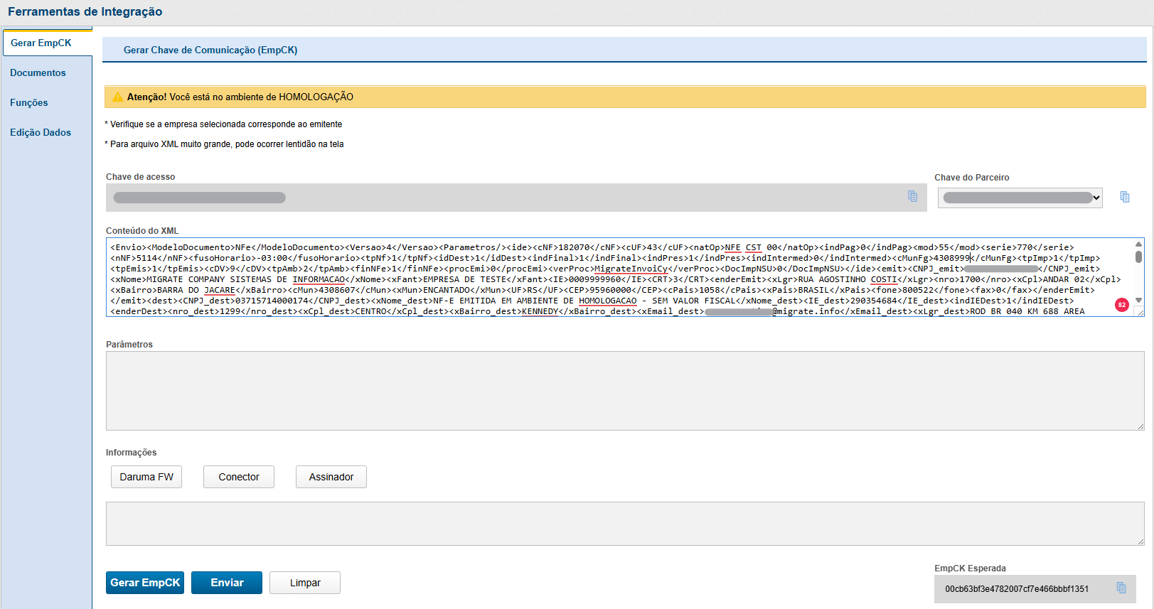 Posteriormente, é necessário clicar em "Gerar EmpCk" e aguardar a geração do hash MD5 na opção "EmpCK Esperada". Este Hash deverá ser comparado com o código gerado pelo seu sistema. Caso o resultado exibido nesta opção seja diferente do que foi gerado pelo seu sistema, recomenda-se revisar o XML, removendo caracteres especiais, espaços e quebras de linha.