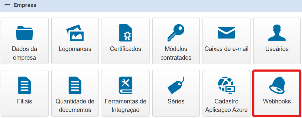 Para realizar o cadastro de Webhook para uma empresa específica, acesse o InvoiCy, selecione a empresa em questão, e em "Painel de controle" selecione a opção "Webhooks" do grupo Empresas.