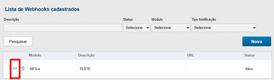 Após preencher os filtros desejados, selecione a opção "Pesquisar" para que eles sejam listados na tela. No canto direito desta tela, clique em "Novo" para abrir a tela de Webhook e preencha os campos abaixo para realizar o cadastro: