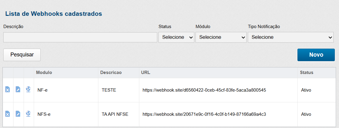 Em seguida, na tela "Lista de Webhooks Cadastrados" serão listados os Webhooks previamente cadastrados para a empresa. Os mesmos também poderão ser localizados utilizando os seguintes filtros: