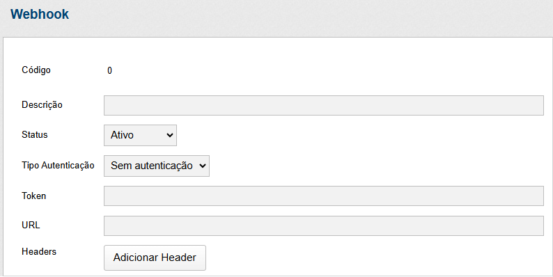 Para cadastrar um novo Webhook, preencha corretamente os seguintes campos: Código: Este campo é preenchido automaticamente pelo InvoiCy, ou seja, estará disponível visualmente apenas para usuários "Administradores".