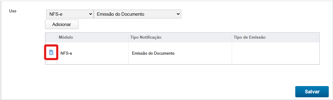 Caso pretenda remover algum registro, clique no ícone de exclusão, que está localizado na linha da informação do módulo cadastrado, como evidenciado acima.