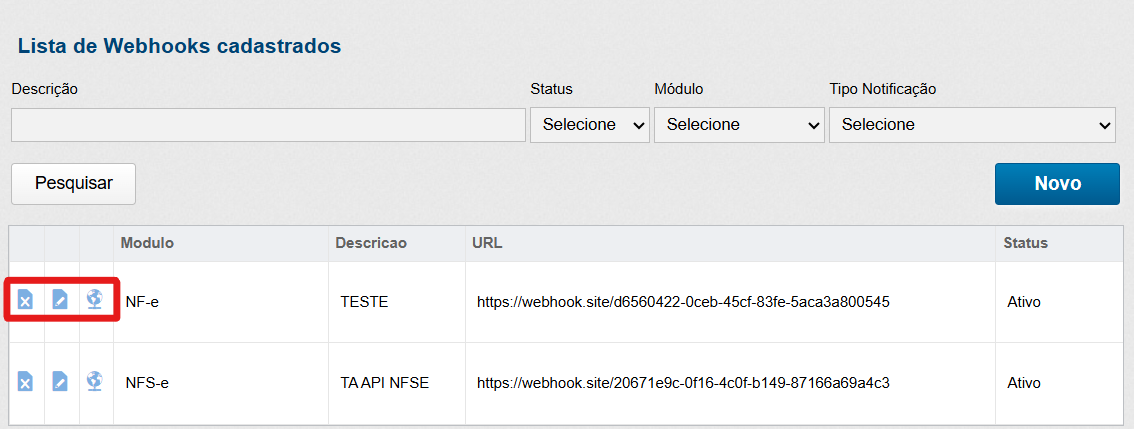 Excluir: Se localiza na primeira coluna. Através dessa opção é possível excluir o Webhook selecionado.