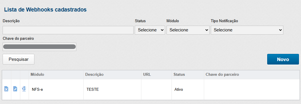 Em seguida, na tela "Lista de Webhooks Cadastrados" serão listados os Webhooks previamente cadastrados e vinculados ao parceiro. Bem como os filtros de "Descrição", "Status", "Módulo", "Tipo Notificação" e "Chave de Parceiro". Este último campo é exclusivo dessa tela para o parceiro.