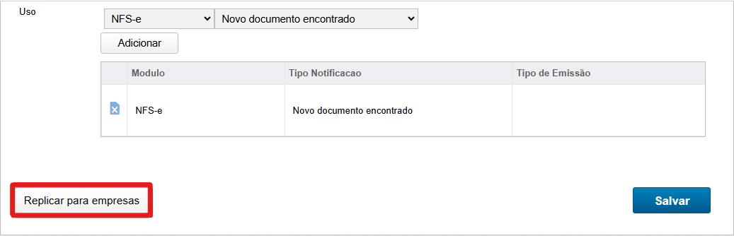 Após inserir o módulo e o tipo de notificação, selecione o botão de "Aplicar" e o registro ficará salvo na tela. Esse processo pode ser realizado inúmeras vezes nesta mesma tela para módulos diferentes. No entanto, não é possível repetir o mesmo uso (Módulo e Tipo de notificação).