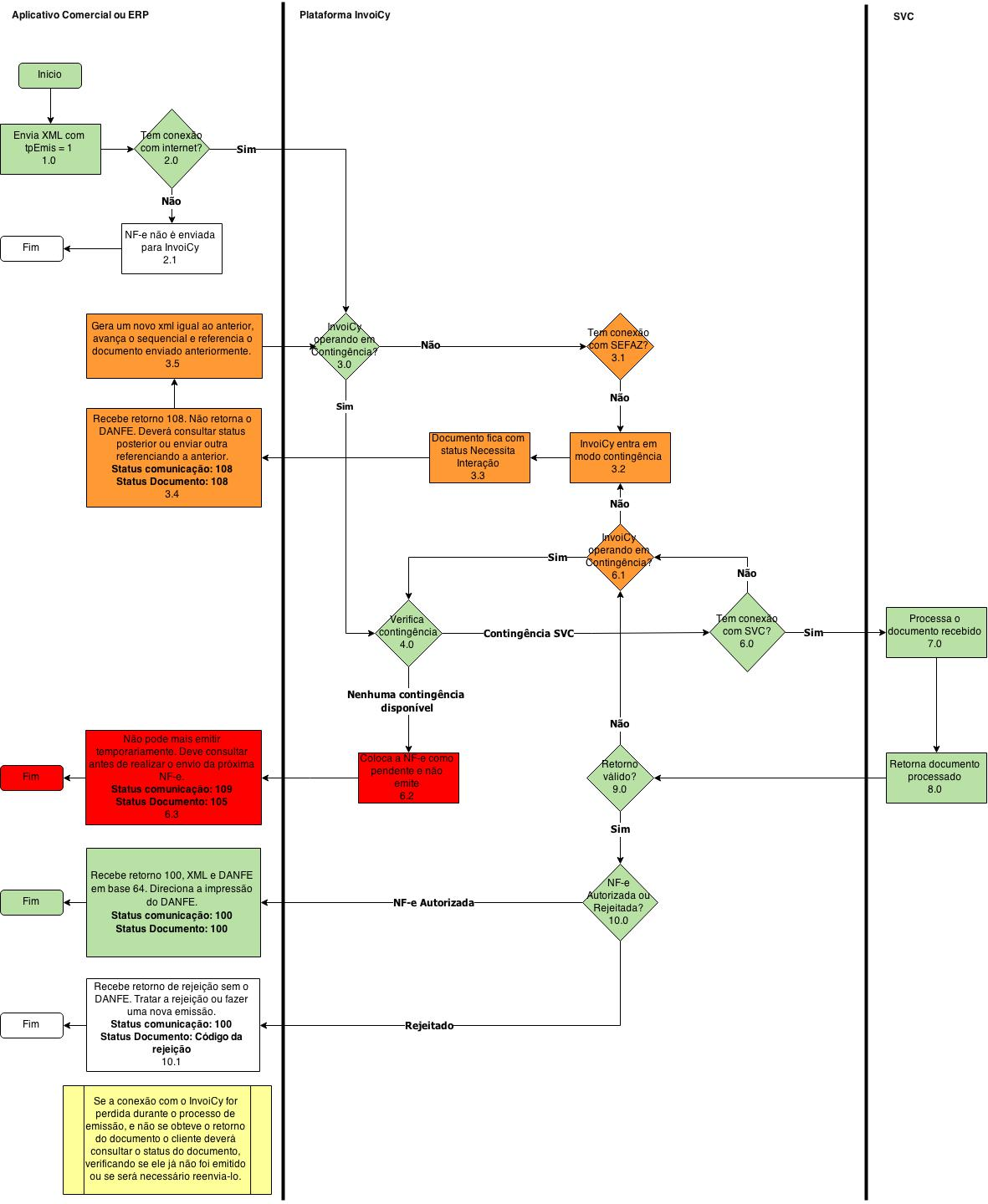 Se a contingência SVC estiver configurada como primeira opção na tela das configurações para emissão, o InvoiCy realizará o envio do documento para o ambiente da SVC, que uma vez estando ativo, fará as validações do documento e em caso de efetivação o emissor receberá como retorno o código 100, o arquivo XML e o DANFE (conforme configurações da empresa), indicando que o documento foi autorizado. Neste caso o processo de envio em contingência foi executado com sucesso, a venda está autorizada e o emissor não tem a necessidade de consultar o status do documento, pois conforme vimos anteriormente, a sincronização entre os ambientes será automática.