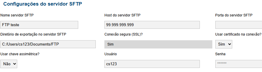 Nas "Configurações do Servidor SFTP", é preciso preenhcer dados como o nome, o host e a porta do servidor, o diretório de exportação do servidor SFTP, dentre outras informações relacionadas ao servidor SFTP.