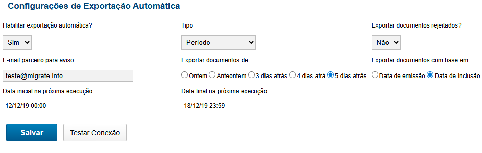 Dessa forma, ao selecionar as datas e clicar em "Incluir" no final da tela, e por conseguinte em "Salvar", será permitido exportar os documentos desejados de acordo com a data configurada, mesmo que este coincida com o agendamento da exportação automática, que deverá rodar normalmente.