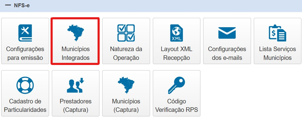 Para realizar a consulta de municípios integrados através do InvoiCy, acesse "Painel de Controle", localize o grupo NFS-e e clique sobre o ícone "Municípios Integrados", conforme demonstrado a seguir: