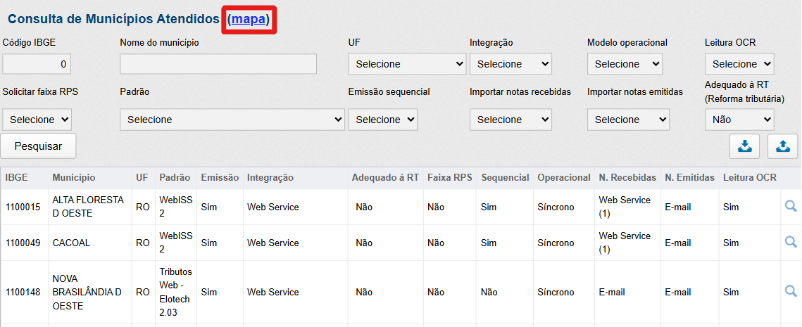 Além da possibilidade de acessar o mapa de consulta de municípios integrados, clicando aqui ou por meio da opção destacada logo abaixo: