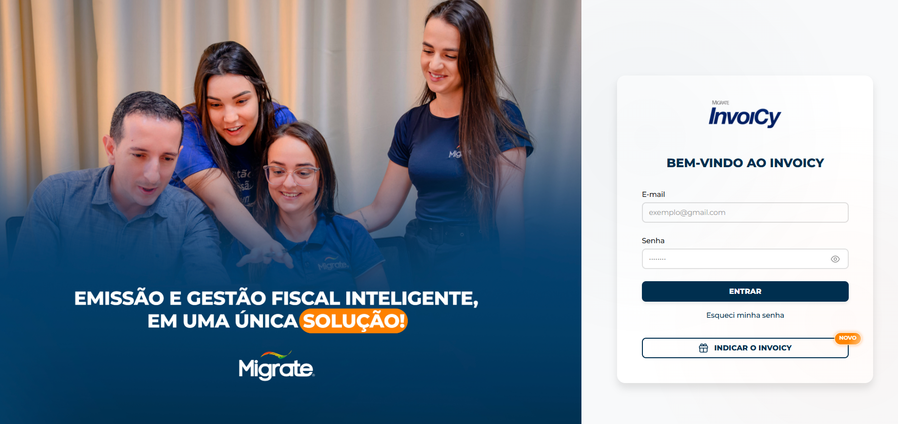 Essa versão do InvoiCy traz uma nova tela de login, mais moderna, intuitiva e alinhada à identidade visual da Migrate, melhorando também a experiência do usuário ao acessar o sistema.