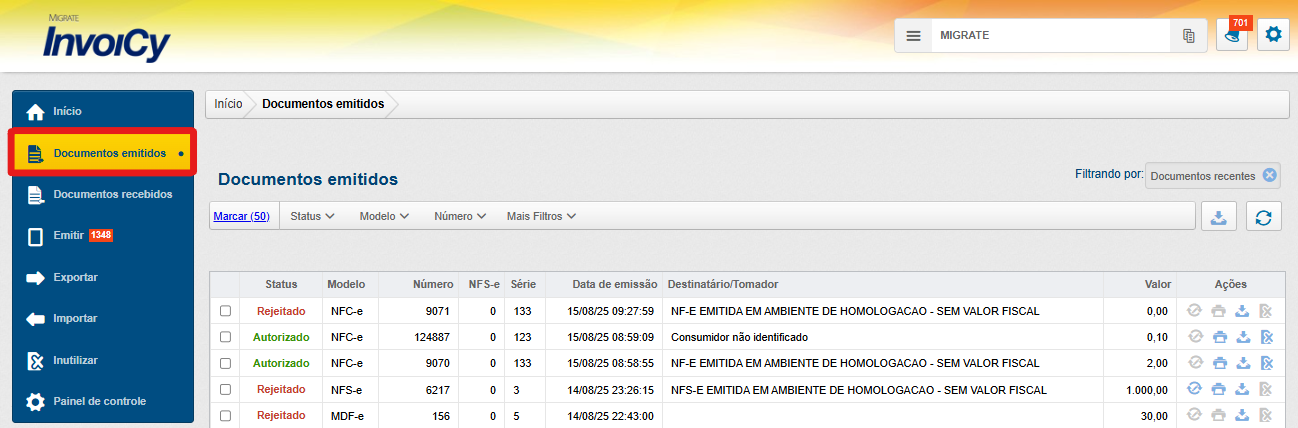 A plataforma InvoiCy dispõe de um menu principal, e nele se encontra a seção "Documentos Emitidos", que permite visualizar todos os documentos emitidos através do CNPJ da empresa selecionada, independentemente do tipo de integração pela qual o documento foi emitido.