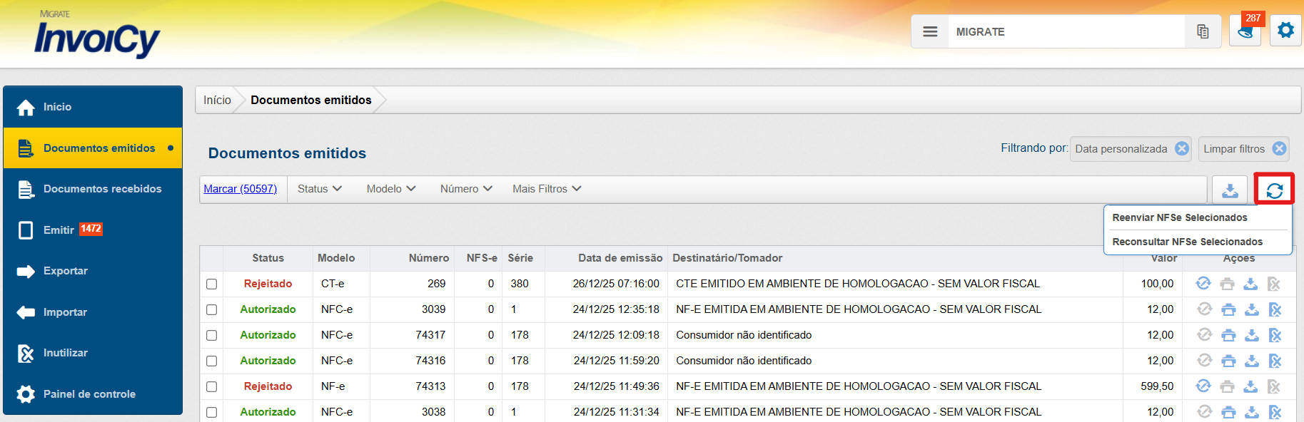 - Reenviar NFSe Selecionados: Permite processar novamente as notas que não atingiram um status final de autorização. Esta ação é voltada para documentos com status "Rejeitado" ou "Pendente", submetendo-os novamente para validação.