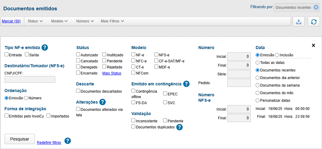 Conforme mencionado anteriormente, os documentos emitidos podem ser localizados por meio dos seguintes filtros: