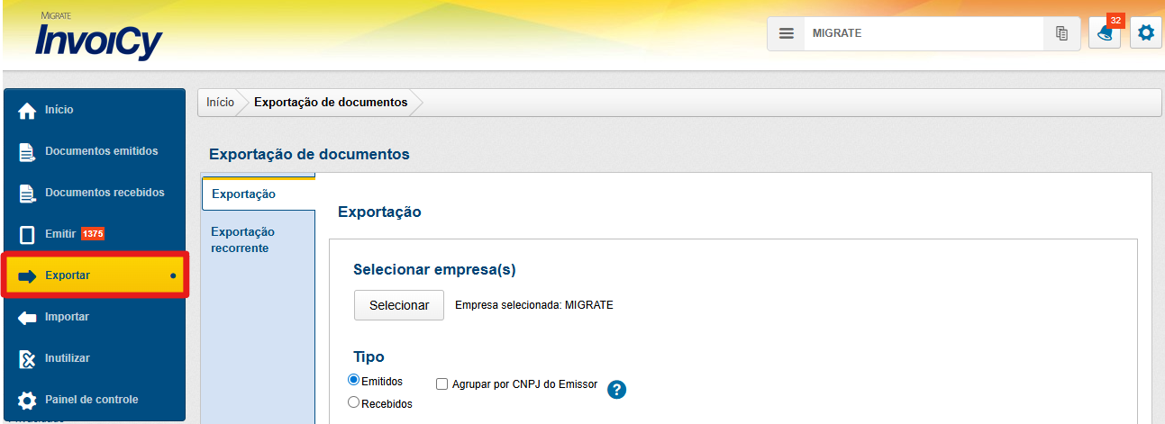 Esta tela exibe duas abas para realizar a exportação de documentos, sendo estas a "Exportação" e a "Exportação Recorrente".
