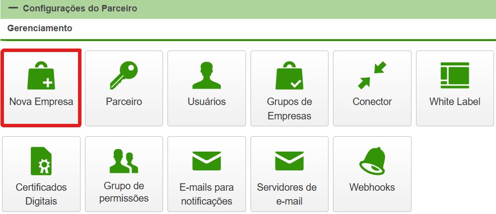 No "Painel de Controle" do InvoiCy, localize o grupo Configurações do Parceiro – Gerenciamento e clique em "Nova Empresa", conforme destacado abaixo: