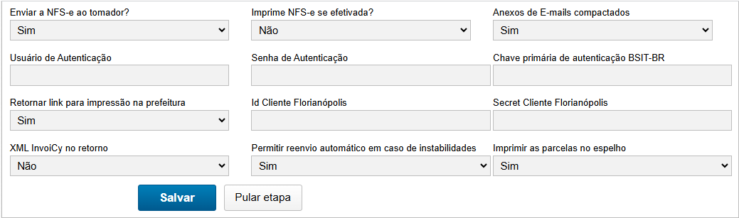 No entanto, se a etapa for habilitada devido ao parceiro ter alguma empresa NFS-e, mas sua empresa atual não integrar com este módulo não é necessário o preenchimento dos campos, podendo dar seguimento ao cadastro clicando no botão "Pular etapa".