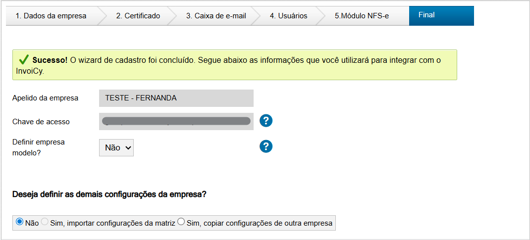 Com a conclusão da inserção das informações requisitadas para realizar o cadastro da empresa, será apresentado um breve resumo das informações da empresa, como o apelido, a chave de acesso que deverá ser utilizada no ERP, AC ou DLL para validar a comunicação e a opção de definir a empresa como modelo. Além disso, através das opções indicadas a seguir, defina se pretende prosseguir com as demais configurações da empresa: