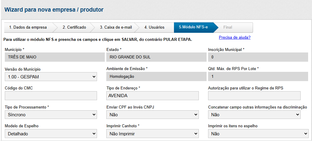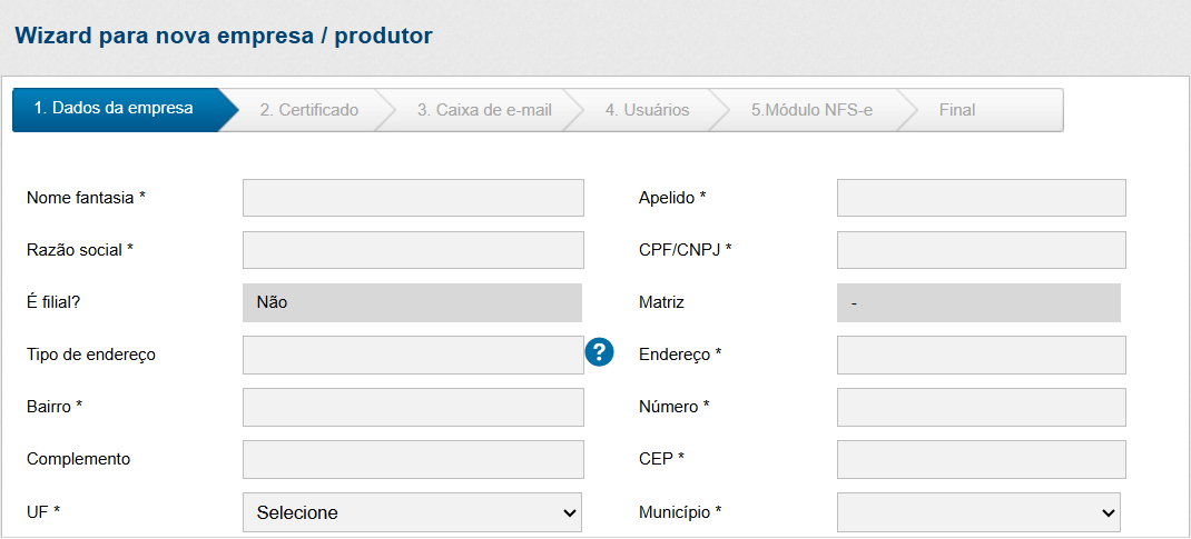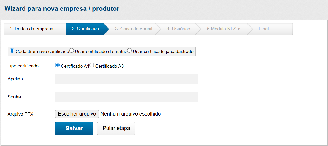 Vale ressaltar, que esta e todas as demais etapas posteriores do Wizard podem ser puladas. Contudo, o cadastro da empresa não será descartado, somente o deixará incompleto.