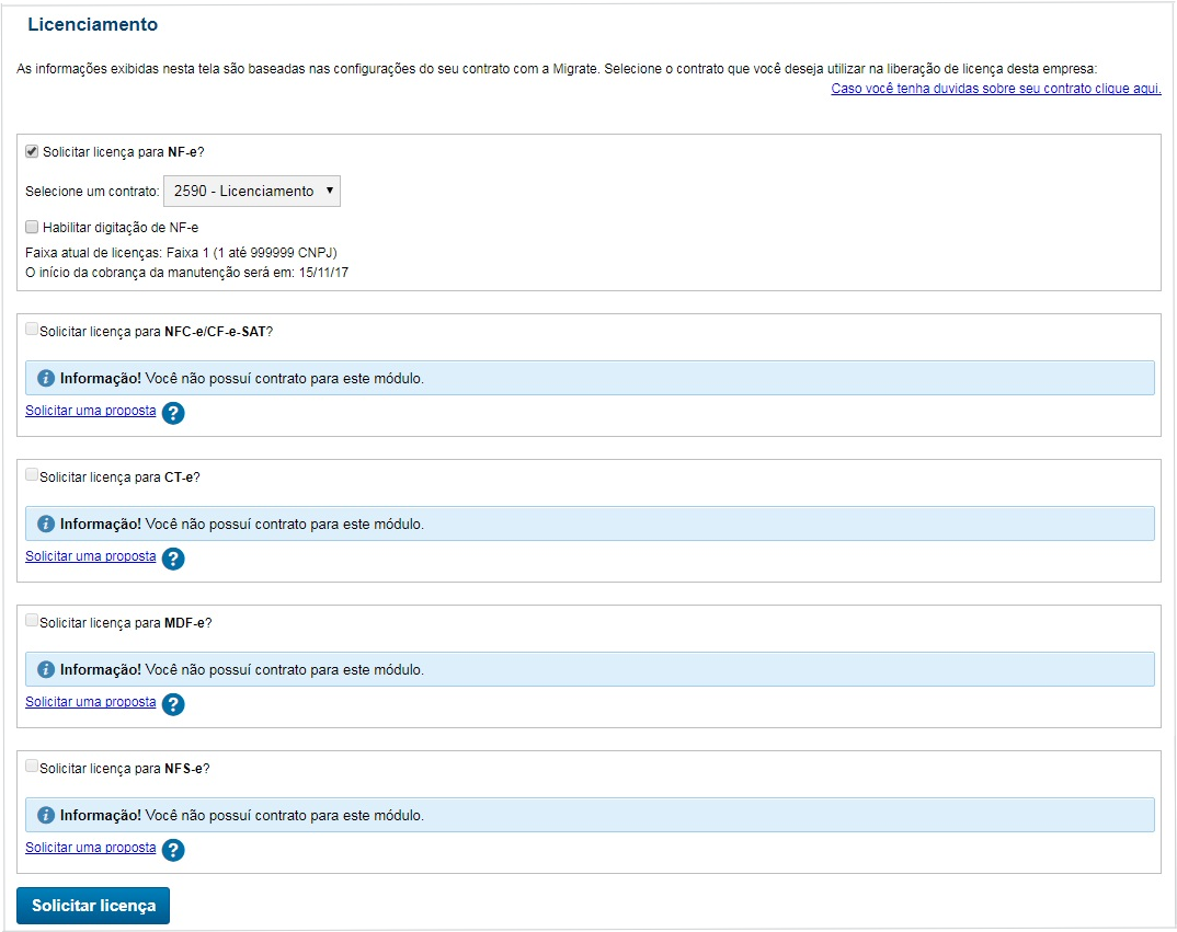 Ressaltando que, se não for definido nenhum contrato durante o cadastro da empresa, a licença será solicitada automaticamente, mas somente na primeira emissão da empresa.