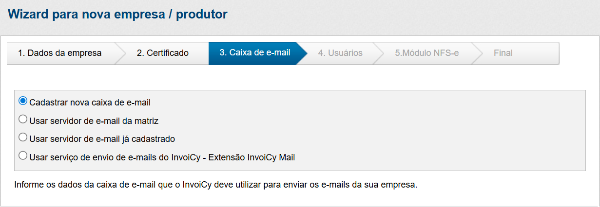 Nessa etapa, é possível configurar um remetente padrão para receber os e-mails referentes a sua empresa. Para receber e-mails de alertas e notificações do InvoiCy a empresa deve realizar o cadastro de uma caixa de e-mail, que o InvoiCy utilizará para enviar e-mails do emissor aos seus clientes.