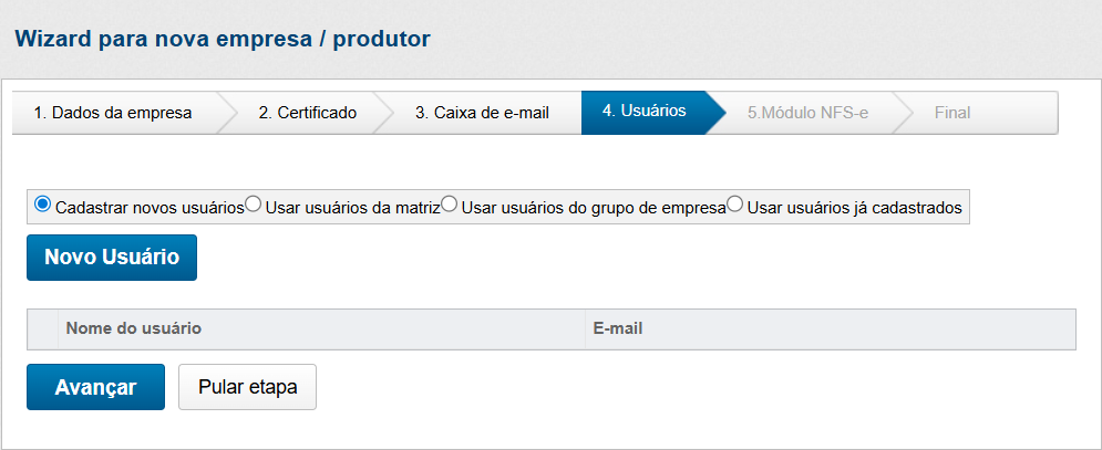 Usar Usuários do Grupo de Empresa: Se na etapa de "Dados da Empresa", a empresa em cadastro tenha sido vinculada a um grupo de empresas, esta opção estará habilitada e poderá ser utilizada para replicar os usuários cadastrados nas empresas deste grupo de empresas.