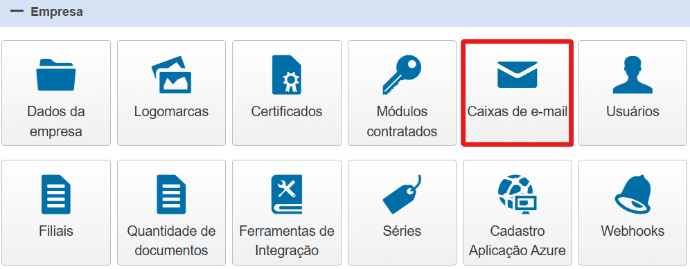 Com o intuito de realizar o cadastro de caixas de e-mail para a empresa, acesse o "Painel de Controle" do InvoiCy, localize o grupo Empresa e clique sobre o ícone "Caixas de E-mail", conforme destacado abaixo: