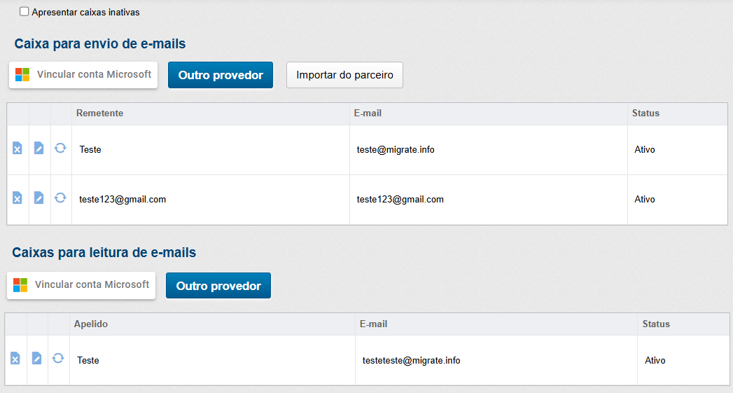 Destacando que, deve ser selecionada uma caixa específica para esta função, pois o serviço da aplicação realiza a leitura do e-mail e a exclusão em seguida. Além disso, podem ser configuradas inúmeras caixas de e-mail para envio e leitura, sendo possível visualizá-las de acordo com o seu status.