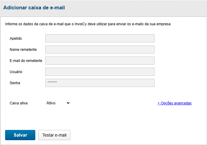 Informe os dados da caixa de saída que o InvoiCy utilizará para enviar os e-mails da empresa, como apelido da caixa, nome e e-mail do remetente, usuário, senha e selecione o status da caixa ativa como "Ativo". Nas opções avançadas, configure o endereço SMTP, porta, se possui conexão SSL, autenticação, validação do certificado digital e o tempo de timeout. Além disso, é possível realizar um teste para verificar a comunicação com a caixa de e-mail, através do botão "Testar E-mail.