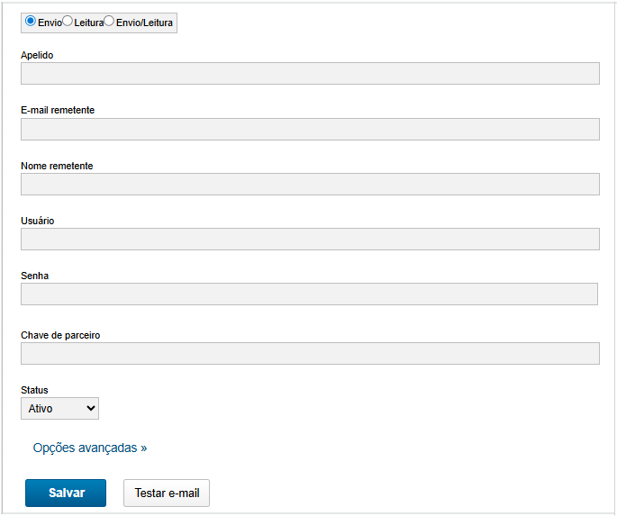 Além disso, por meio da opção "Opções Avançadas" é possível preencher informações mais específicas sobre os campos do cadastro. Do contrário, se um servidor de e-mail for cadastrado previamente para o mesmo host, as opções avançadas serão preenchidas automaticamente.