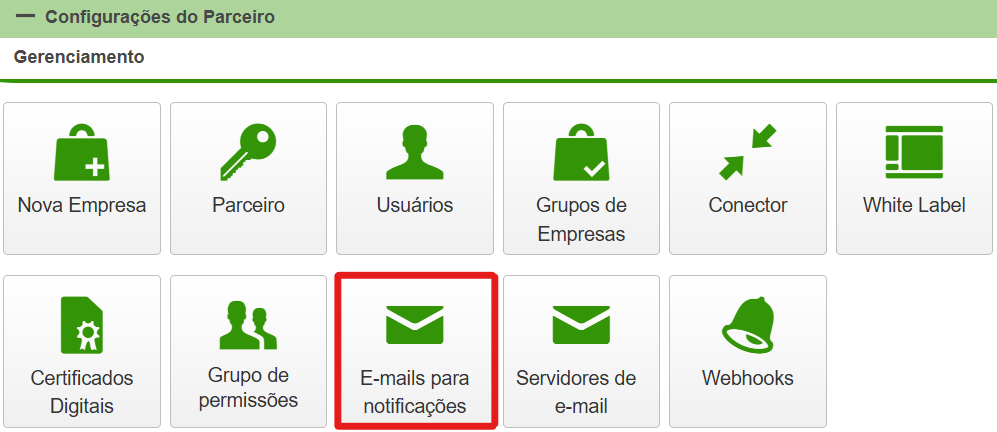 No "Painel de Controle" do InvoiCy, localize o grupo Configurações do Parceiro - Gerenciamento e clique em "E-mails para Notificações" para iniciar o processo de cadastro dos endereços de e-mails, conforme demonstrado abaixo: