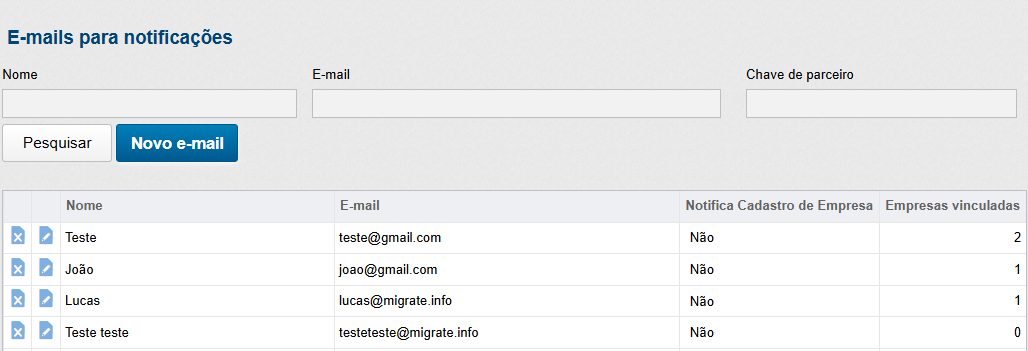 Através deste ícone será apresentada uma nova tela, onde serão exibidos os e-mails previamente cadastrados e empresas vinculadas, juntamente com a opção de editar e excluir estes e-mails.