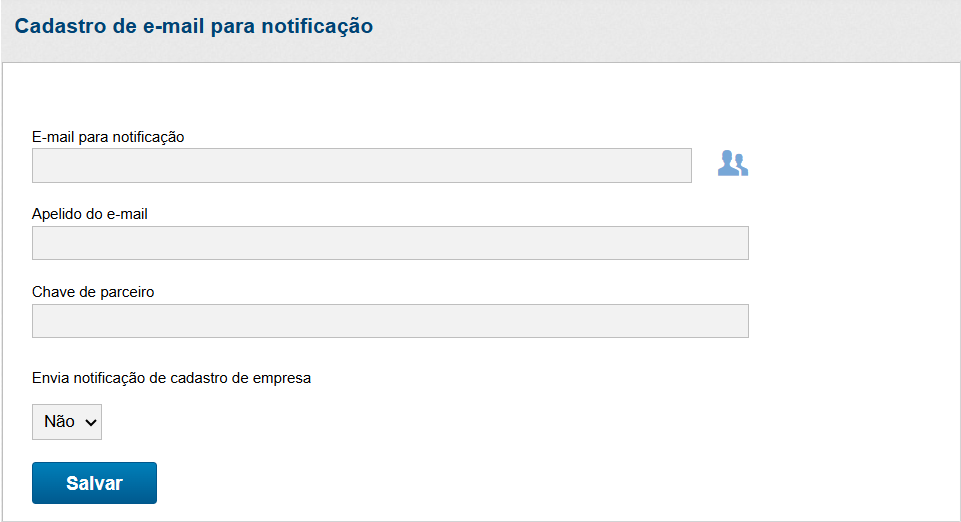 Se o endereço de e-mail destinado ao recebimento de notificações ainda não estiver registrado, é necessário proceder com o seu cadastro. Este processo pode ser realizado através do ícone específico de e-mails para notificações.