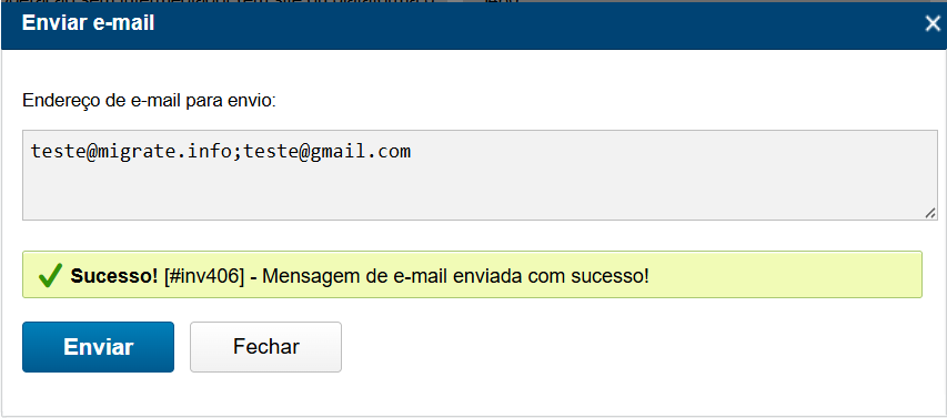 Ao clicar no botão enviar aparecerá uma mensagem em tela informando sobre o status da operação, ou seja, se o e-mail foi enviado com sucesso ou se ocorreu alguma falha durante o processo de envio.