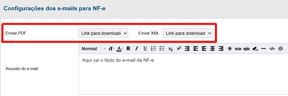 Ao selecionar a opção "Em anexo" para ambos os campos, os arquivos PDF e XML serão anexados junto ao e-mail. Selecionando a opção "Link para download", um link será enviado junto ao texto do e-mail. E marcando a opção "Não enviar", o destinatário do e-mail não receberá os documentos XML e PDF do documento.