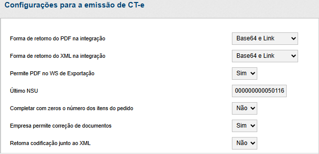 Nesta tela, é possível configurar inicialmente, as formas de retorno do XML e do PDF na integração, a permissão do PDF na integração, o último NSU, se é necessário completar com zeros o número de itens do pedido, se a empresa permite a correção de documentos e se retorna codificação junto ao XML.