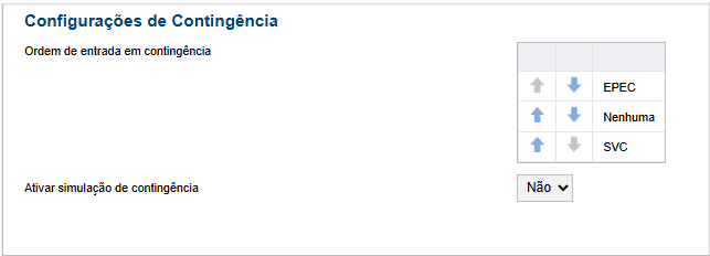 Além disso, estão disponíveis os parâmetros para configuração de contingência. Entre eles, destaca-se o campo "Ordem de entrada em contingência", que define a prioridade utilizada pelo sistema ao entrar em contingência. Dentre as opções de escolha, é possível selecionar: SEFAZ Contingência Virtual (SVC), Evento Prévio de Emissão em Contingência (EPEC) ou nenhuma das alternativas, conforme demonstrado a seguir: