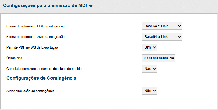 Nesta tela, é possível definir diferentes parâmetros para a emissão, como: as formas de retorno do PDF e XML na integração, a permissão do PDF na integração, o último NSU e se é necessário completar com zeros o número de itens do pedido.