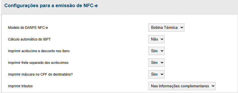 Nesta tela, é possível definir diferentes parâmetros para a emissão, como: o modelo de DANFE-NFC-e, as formas de retorno do PDF e XML na integração, a permissão do PDF na integração, o último NSU, se é necessário completar com zeros o número de itens do pedido, dentre outras opções disponíveis.