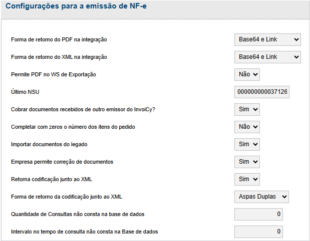 Nesta tela, é possível configurar inicialmente, as formas de retorno do XML e do PDF na integração, a permissão do PDF na integração, o último NSU, se é necessário completar com zeros o número de itens do pedido, importar documentos do legado, se a empresa permite a correção de documentos, dentre outras opções disponíveis.