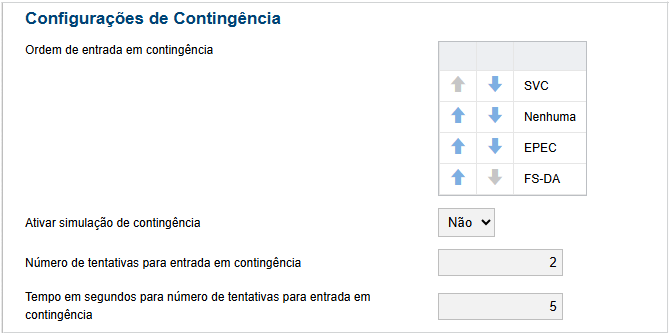 Além disso, estão disponíveis os parâmetros para configuração de contingência. Entre eles, destaca-se o campo Ordem de Entrada em Contingência, que define a prioridade utilizada pelo sistema ao entrar em contingência. Dentre as opções de escolha, é possível selecionar: SEFAZ Contingência Virtual (SVC), Evento Prévio de Emissão em Contingência (EPEC), Formulário de Segurança para DOcumentos Auxiliares (FS-DA) ou nenhuma das alternativas.